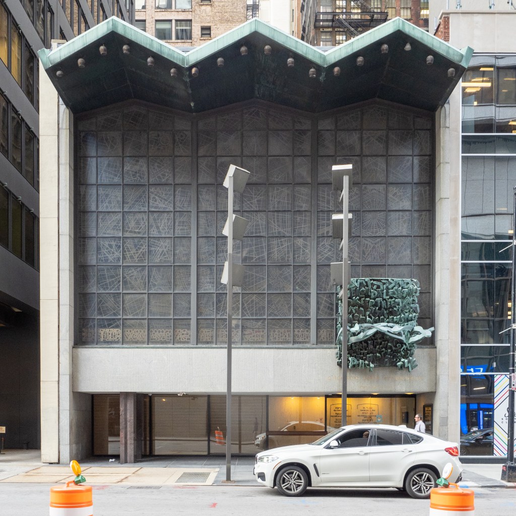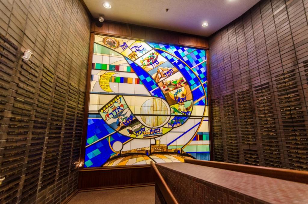 It contains the magnificent Abraham Rattner stained glass artwork which takes up almost the entire Eastern facade of the Synagogue, Rattner lithographs in the Beit Midrash and the entry to the Social Hall and the Hands of Peace by Henri Azaz, which crowns the entrance to